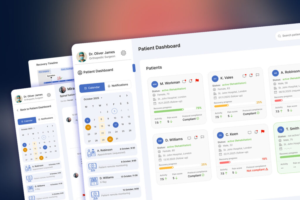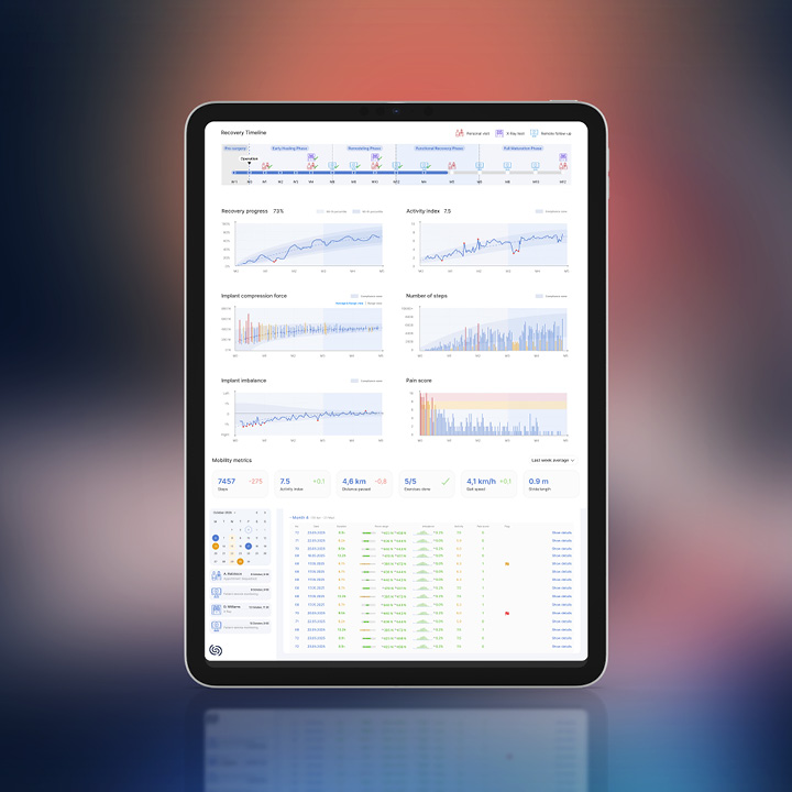 OEM implant manufacturers integrate sensors seamlessly into your surgical workflow. After discharge, the Clinician Dashboard displays the patient list by status. One click reveals recovery trends and PROMs. From the same screen, you can message, schedule a video visit, or book an in-office appointment. You can also export a summary to the chart and set alerts for follow-ups based on your protocol.
